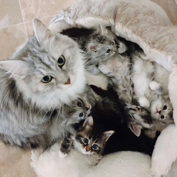 We have some of the sweetest cats alive! Our mommas are Mila, Natasha (we call her Tasha), Anya, Kira and our big boy is Silas. Mila is the queen of the pride; she is a sweet boss and our first Siberian, we were totally hooked once we got her. Tasha is our model queen, always ready to strike a pose and always ready to receive some petting. Anya is the daughter of Mila, she is the sweetest princess of all and very, very chill. Kira is the youngest, the speedster of the group and the most playful with the most energy. Silas is king, he's the coolest cat, he's like "sup guys, I'm just over here chillaxing doing me, you do you"!-)